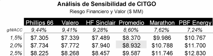 Análisis de Sensibilidad: Las tasas individuales de WACC de las empresas comparables (Valero: 9.41%; Marathon Petroleum: 7.62%; Phillips 66: 9.44%; HF Sinclair: 9.28%; PBF Energy: 7.24%) se utilizaron para modelar los análisis de sensibilidad.