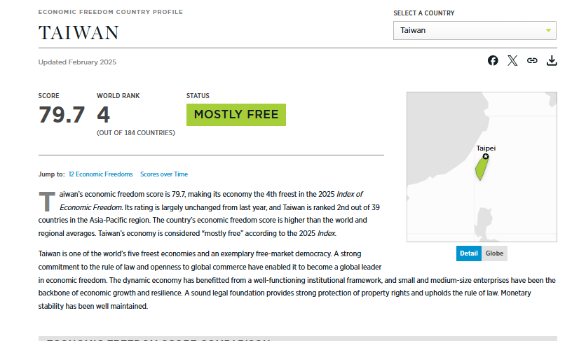 Índice de libertad económica de Taiwán: 79,7/80.