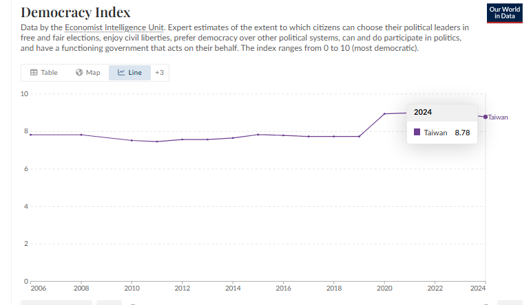 Índice de democracia de Taiwán: 8,78/10. Fuente: Freedom House.