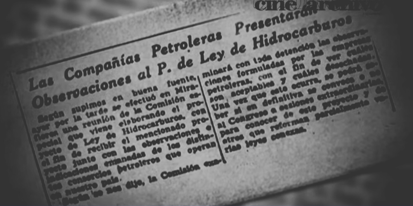 - Fotograma del documental “El Reventón. Los inicios de la producción petrolera en Venezuela”, pieza del director, Carlos Oteyza. Bolívar Films, colección Cine Archivo (2007).