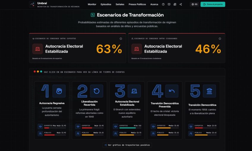 Umbral surge directamente de la investigación académica sobre transiciones de régimen. Su arquitectura analítica se basa en la metodología de Episodios de Transformación de Régimen (ERT, por sus siglas en inglés) del Instituto V-Dem, que enmarca la incertidumbre de las transiciones autoritarias en escenarios concretos y medibles. La plataforma traduce ese marco teórico en datos accionables y visualizaciones interactivas, accesibles para cualquier persona.