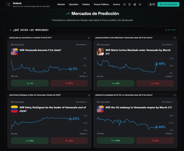 - Mercados de predicción — Contratos de Polymarket relacionados con el escenario político venezolano.