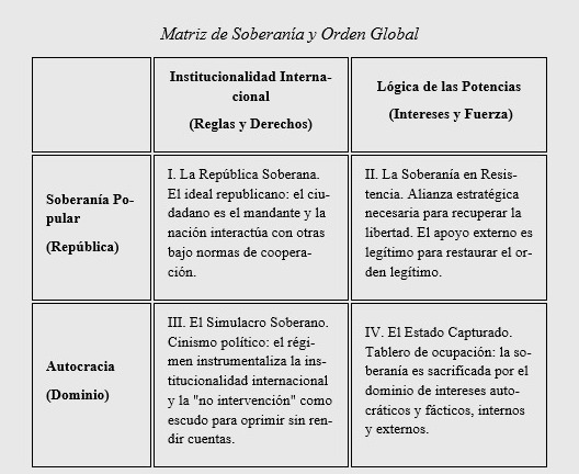 2. El riesgo de la alianza necesaria: En la «Soberanía en Resistencia» (Cuadrante II), el pueblo busca el auxilio de potencias democráticas para recuperar su libertad. Es un paso estratégico legítimo, pero delicado. El auxilio de una potencia debe ser entendido como el andamio, pero no la casa. Sin una conducción nacional firme y con visión de Estado, el auxilio deriva en un tutelaje permanente. La ayuda externa debe servir para reedificar la arquitectura republicana, no para entregar sus llaves de forma indefinida.