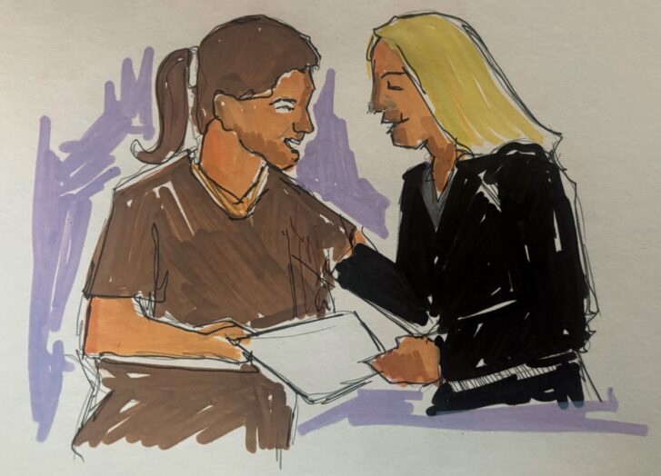 La ilustradora mítica Jane Rosenberg estuvo otra vez como dibujante de corte en esa sala del piso 26. Tiene 76 años, un sitial asignado e ilustraciones inolvidables como las de las audiencias de Epstein y Maxwell. Como es su costumbre, llevó sus binoculares. También estaba la dibujante Elizabeth Williams, cuyos bocetos se caracterizan por mostrar detalles de los detenidos.