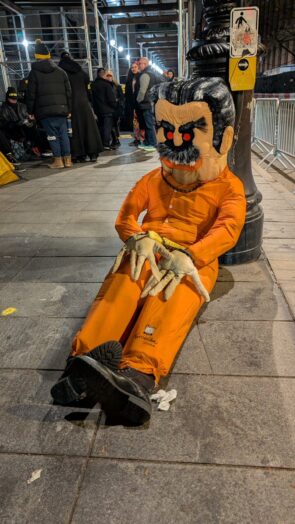 Afuera del edificio, y a no más de 11 °C, estuvieron los manifestantes: venezolanos que cantaron el himno nacional y activistas extranjeros del régimen venezolano que gritaron sus consignas en inglés. Un muñeco de Maduro con braga anaranjada y ojos endemoniados, hecho por el ilustrador venezolano Jorge “El Niño” Torrealba, decoró la acera neoyorquina.