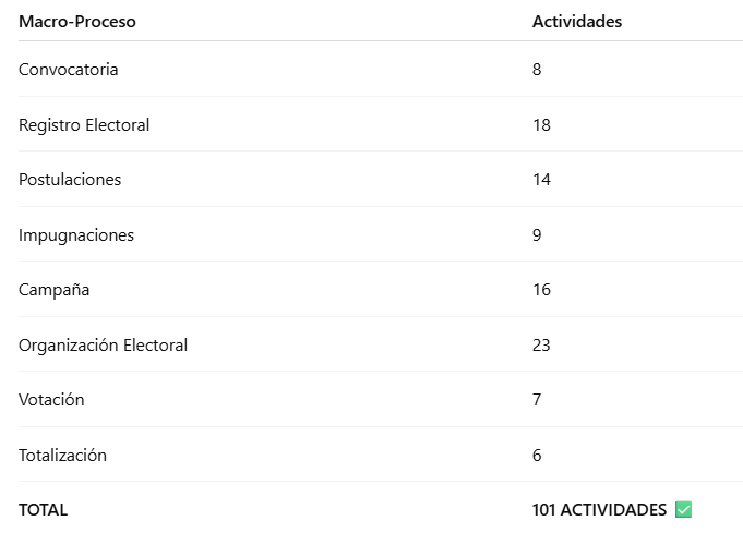 La arquitectura real del proceso electoral son 101 actividades, no una fecha