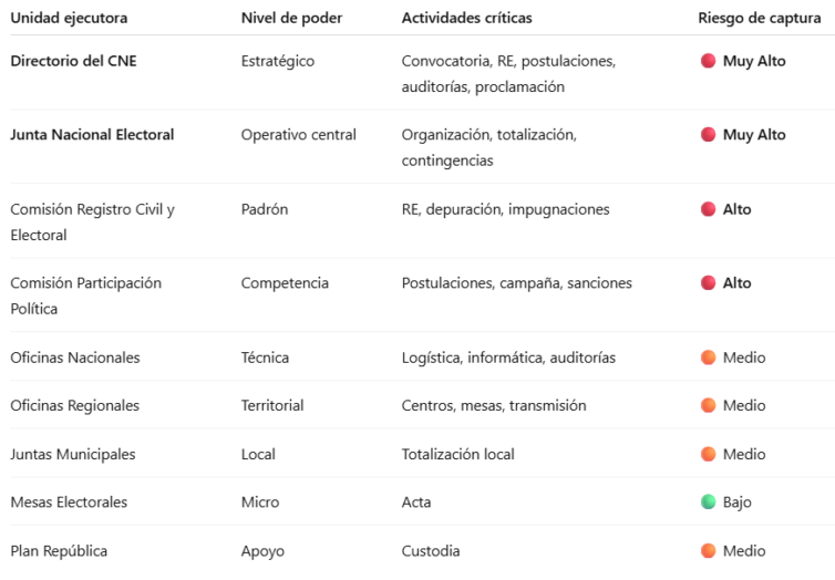 Los procesos involucran múltiples instancias: Directorio, Secretaría General, Junta Nacional Electoral, comisiones, oficinas nacionales y regionales, juntas y mesas electorales, con apoyo operativo del Plan República. Pero no todas esas instancias tienen el mismo peso decisorio. Las decisiones críticas se concentran en puntos muy concretos: la convocatoria y la fecha electoral, la aprobación y modificación del cronograma, el corte del Registro Electoral, la admisión o rechazo de postulaciones, las sustituciones fuera de tiempo material, las medidas en campaña, el orden y alcance de las auditorías y la gestión de contingencias. Allí es donde se define si el proceso será una garantía de democracia o solo una simulación.